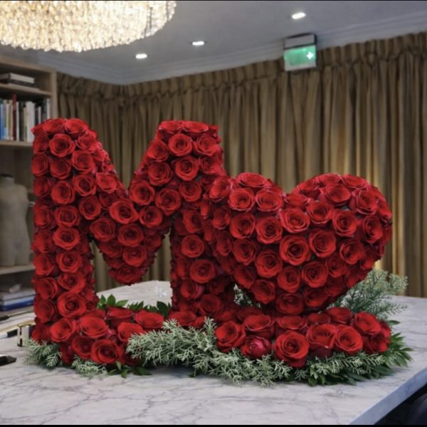 This is a stunning heart-shaped floral arrangement made entirely of vibrant red roses. The arrangement appears to be about 2.5feet tall and 1.5 feet wide, making it an eye-catching and luxurious centerpiece. Include a vase.